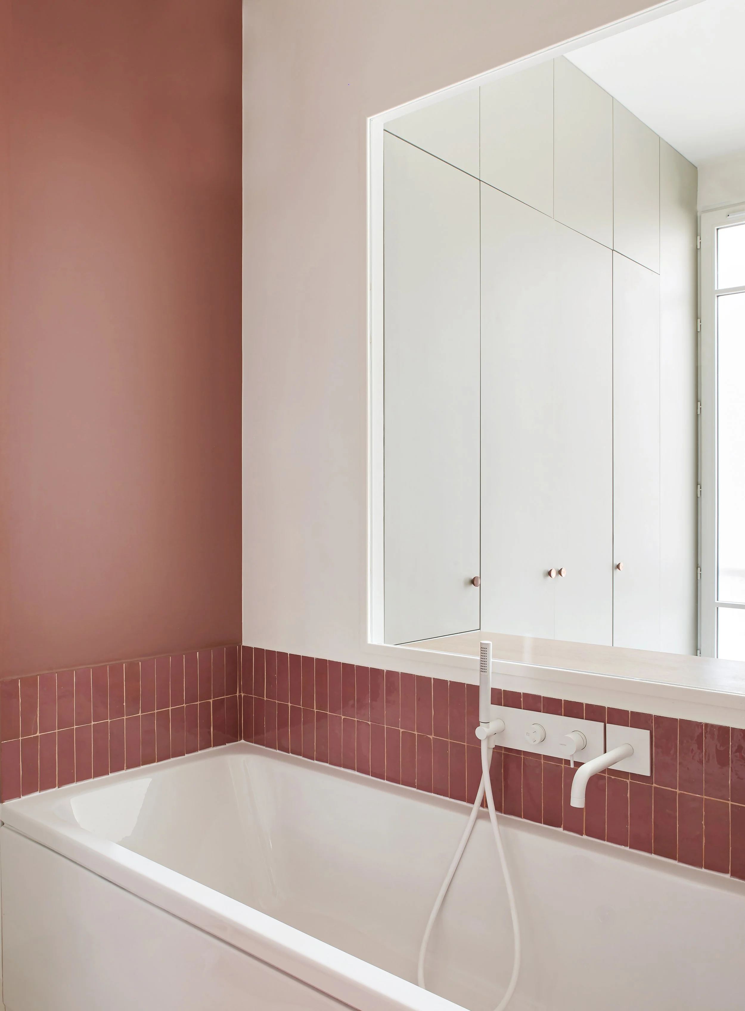 La partie arrière de l’appartement qui accueille les chambres est entièrement revêtue d’un moquette blanche moelleuse totalement compatible avec la présence des deux chiens de la famille. Les salles de bain coordonnées à chaque chambre sont réalisées en béton ciré ton sur ton avec la moquette. Ainsi afin de créer un effet cocoon, lumineux et léger, la palette colorimétrique des différentes chambres joue avec les nuances de beige et de gris qu’offre les peintures Farrow and Ball. Les salles de bains, plus en contraste, ont été spécialement conçu pour chacun des habitants.